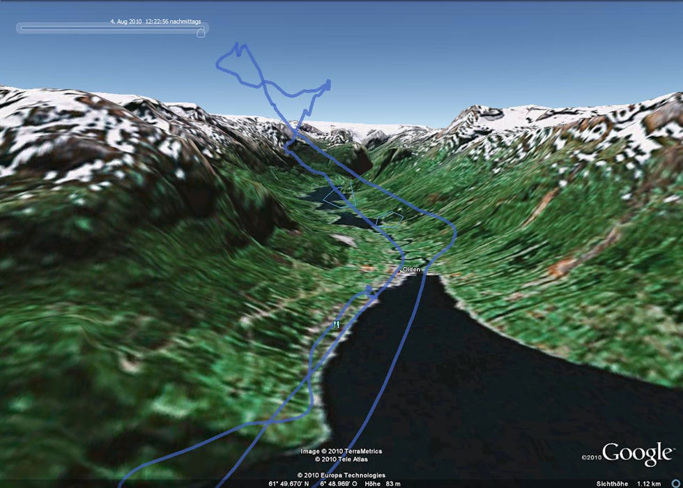 Der Flugweg(Die Strecke wurde von einem Navigationssystem (Garmin Oregon 300) aufgezeichnet und mit Google Earth grafisch dargestellt.) |